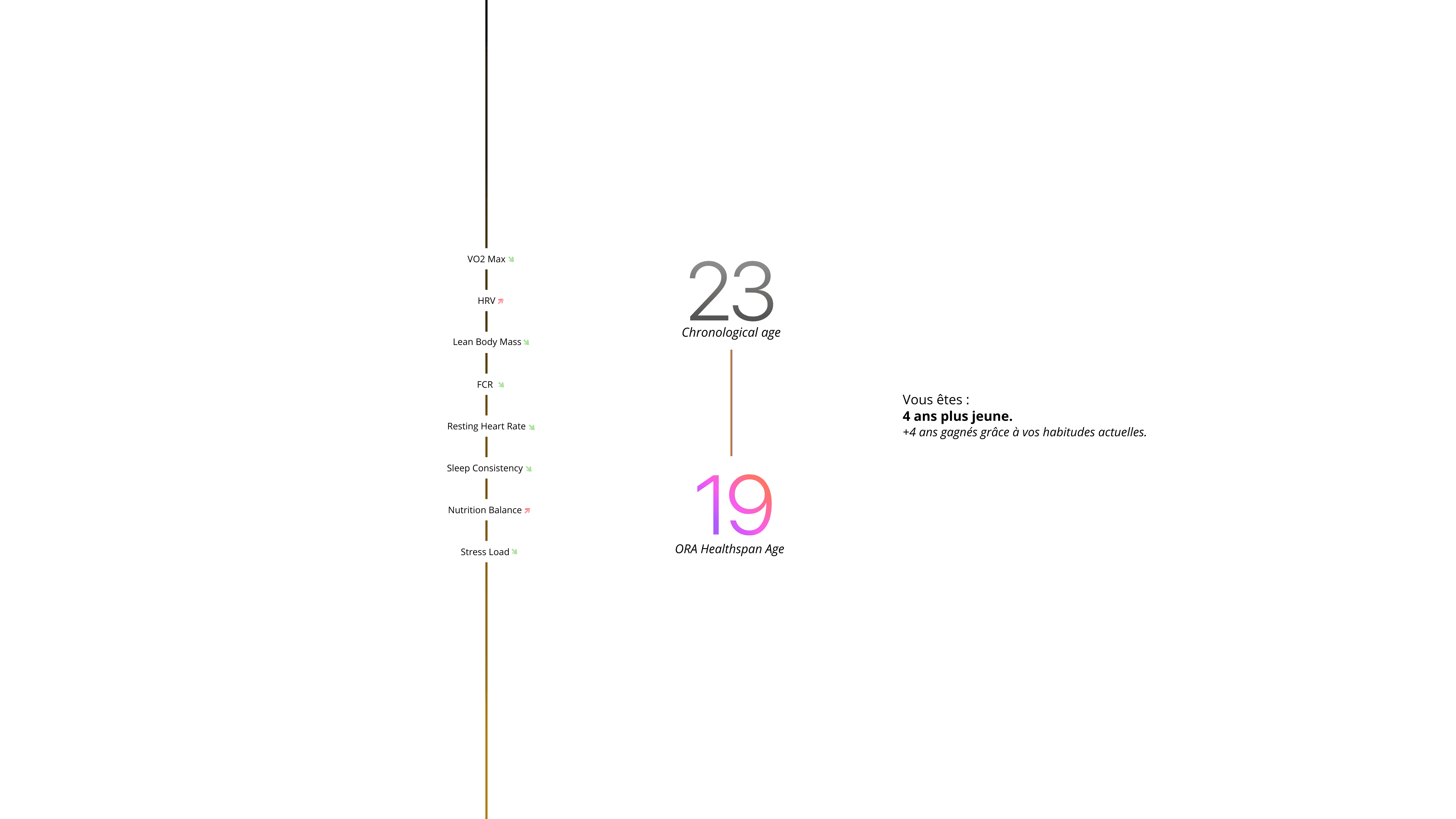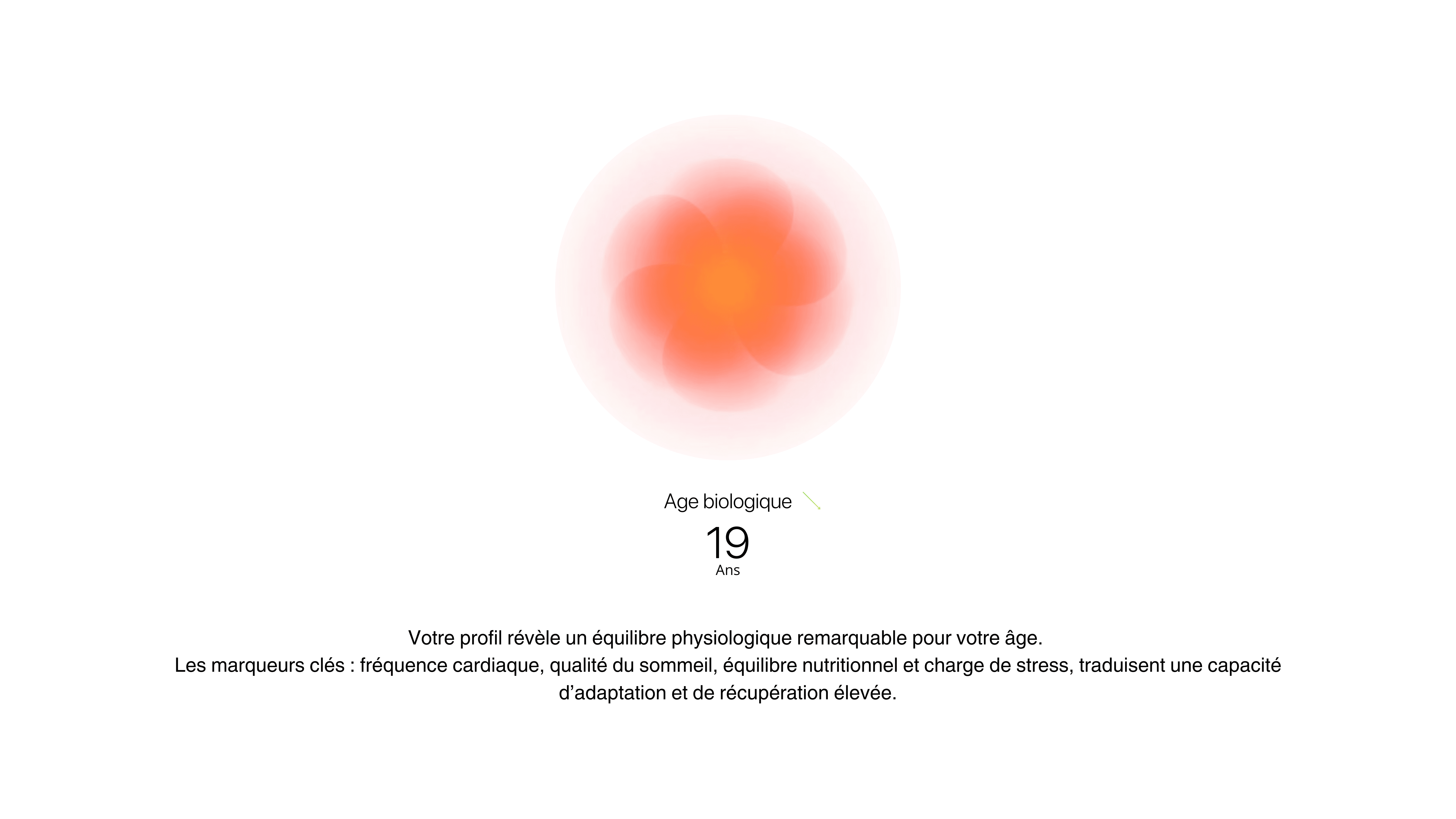 En fonction de vos données, nous avons déterminé que : Pour rajeunir biologiquement le plus vite possible : Priorisez le sommeil : 8h30–9h/nuit, coucher ≤ 23h00, chambre à 17–19 °C, obscurité totale, écrans arrêtés ≥ 60 min avant le coucher. Optimisez le sport (sans en ajouter) : 2 séances Zone 2 (60–75 min), 2 séances force, 1 séance qualitative max + 1 récupération active légère/semaine. Réduisez l’inflammation : poisson gras 3×/sem, thé vert + cacao noir quotidien, hydratation 2,5–3 L/j, viande rouge ≤ 2×/sem. Stabilisez l’énergie : petit-déjeuner ≥ 25–30 g de protéines, caféine uniquement le matin. Abaissez le stress physiologique : 5–10 min/j de respiration lente + lumière naturelle le matin.