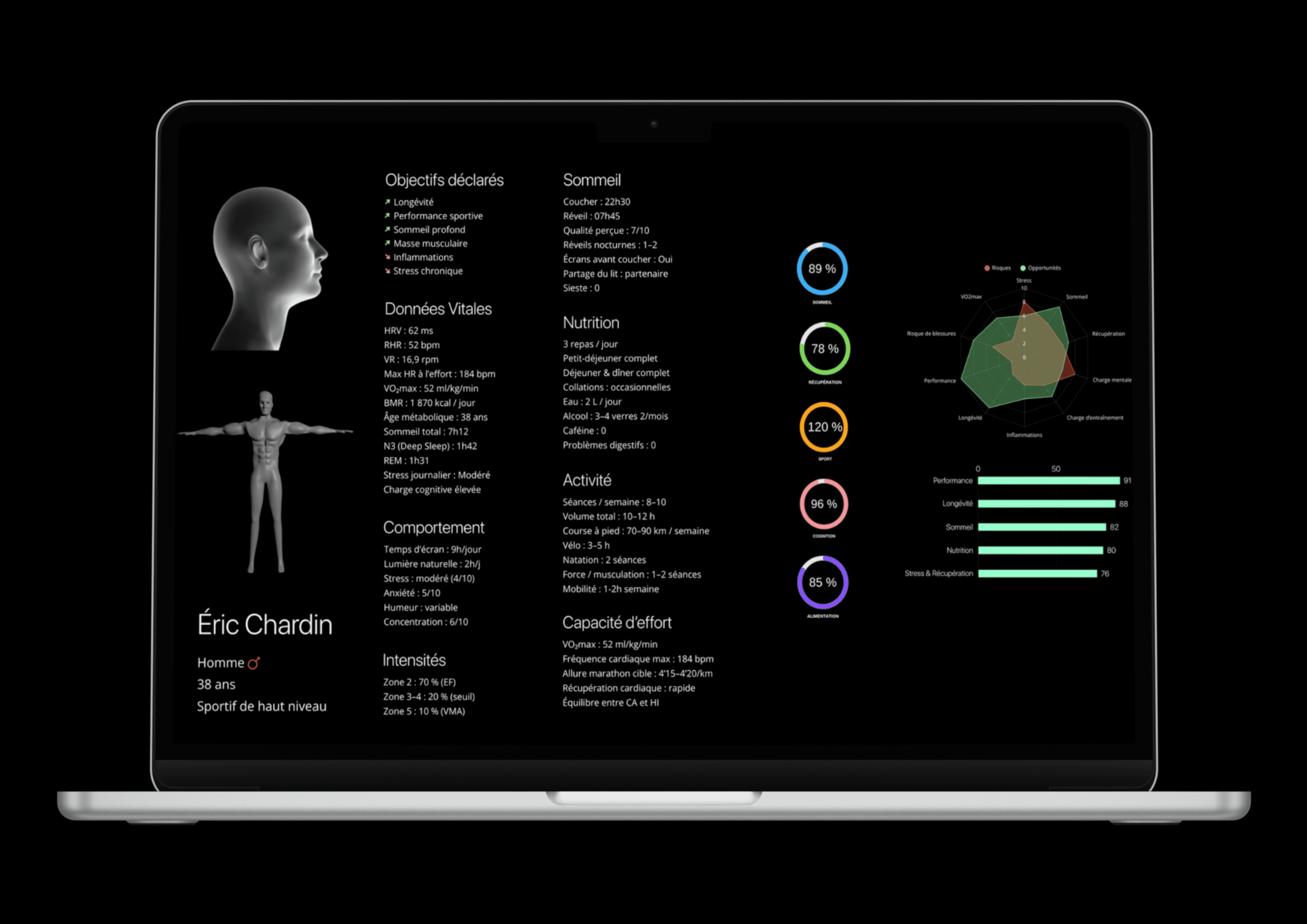 Chaque semaine, le lundi à 7h30, vous recevez des recommandations personnalisées, consultables à tout moment : plan d’entraînement, plan des repas, phases de sommeil recommandées, routines de cognition, etc.
